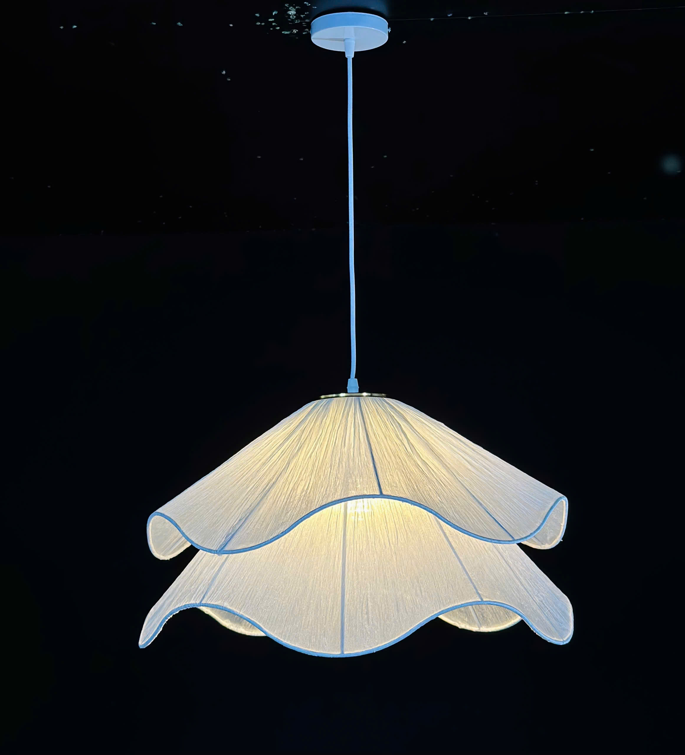 Đèn thả bông hoa lụa màu trắng THD56 sở hữu thiết kế độc đáo mô phỏng những cánh hoa đang nở rộ. Đây là mẫu đèn tiêu biểu cho đèn thả phong cách Wabi Sabi – tôn trọng vẻ đẹp tự nhiên, mộc mạc và bình yên. Với kiểu dáng nhẹ nhàng, sản phẩm dễ dàng trở thành tâm điểm thu hút trong bất kỳ không gian nào.