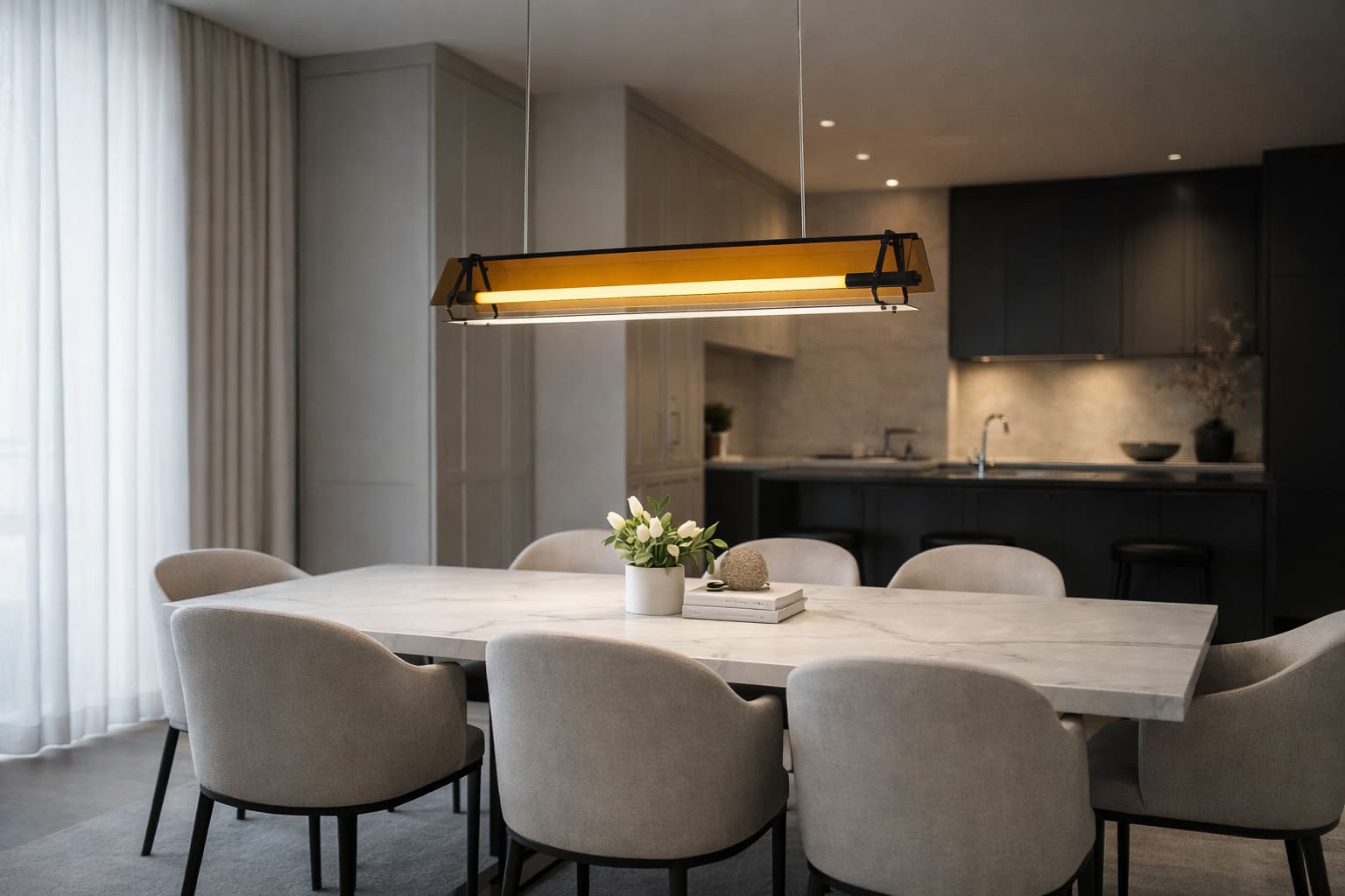 - Đèn thả bàn ăn căn hộ chung cư: Đặc biệt hiệu quả trong việc tạo ra một "vùng không gian ảo", giúp phân tách khu vực ăn uống và phòng khách một cách ước lệ mà không cần vách ngăn kiến trúc.