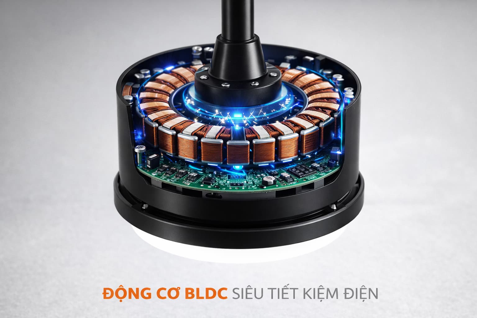 Sản phẩm sử dụng động cơ BLDC (Brushless DC) - công nghệ nam châm vĩnh cửu không chổi than. Đây là mẫu quạt trần động cơ DC tiết kiệm điện tiêu biểu: