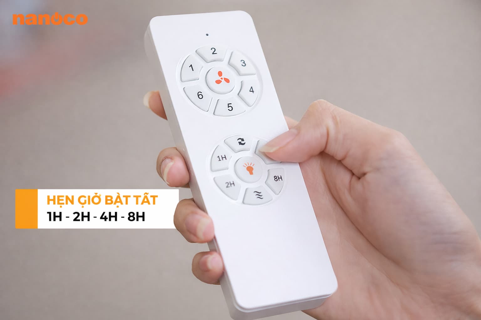 - Điều khiển từ xa (Remote): Giúp bạn điều chỉnh tốc độ gió, màu đèn và hẹn giờ tắt (1h-2h-4h-8h) một cách dễ dàng từ bất kỳ vị trí nào trong phòng.
