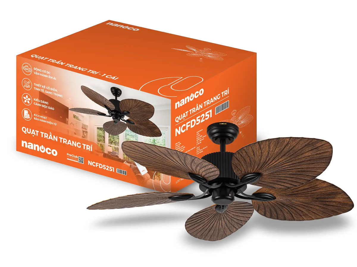 Quạt trần Nanoco 5 cánh lá cọ màu nâu NCFD5251 vẻ đẹp nhiệt đới cho không gian sống hiện đại, bạn đang tìm kiếm một thiết bị làm mát vừa hiệu quả, vừa mang đậm dấu ấn nghệ thuật? Quạt trần lá cọ Nanoco NCFD5251 chính là sự kết hợp hoàn hảo giữa công nghệ hiện đại và vẻ đẹp phóng khoáng của thiên nhiên. Với thiết kế 5 cánh mô phỏng hình lá cọ tinh tế, sản phẩm không chỉ là một chiếc quạt mà còn là "linh hồn" giúp nâng tầm thẩm mỹ cho ngôi nhà của bạn.