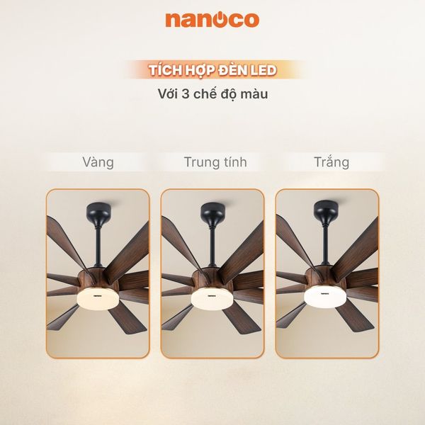 Quạt trần Nanoco 8 cánh màu nâu NCFD6089L có đèn 3 chế độ màu: trắng - vàng - trung tính